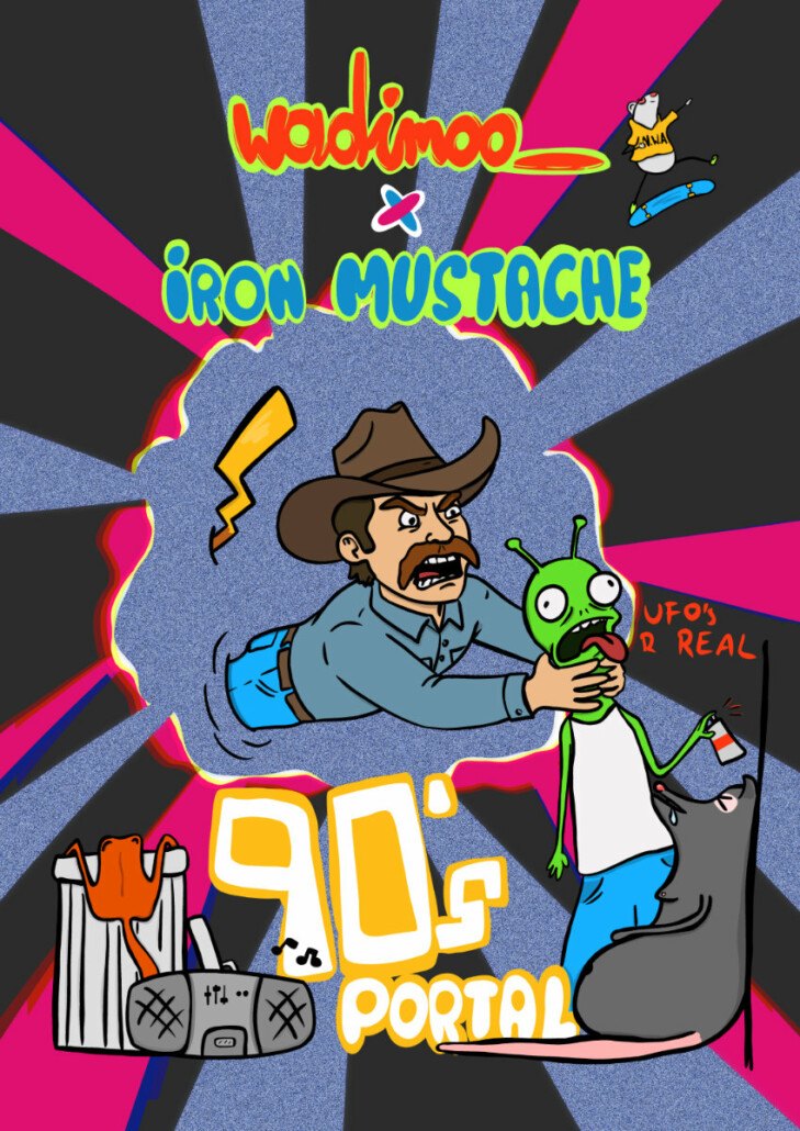 Step into chaos, nostalgia, and absurd humor with my collaboration with Iron Mustache (IG: ironmustache.art). This bold illustrated wall art print combines 90s pop culture energy, comic-book action, and sci-fi absurdity into one dynamic design.