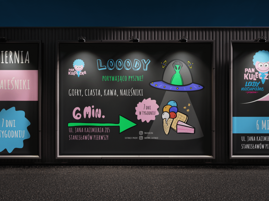 Stworzyłem kolorowy, humorystyczny billboard dla lodziarni Pan Kuleczka. Projekt łączy zabawną ilustrację z wyrazistym typograficznym przekazem, dzięki czemu skutecznie przyciąga wzrok. Całość utrzymana jest w lekkim klimacie i charakterystycznym stylu, co wzmacnia zapamiętywalność marki i sprawia, że reklama wyróżnia się na tle standardowych realizacji outdoorowych.
