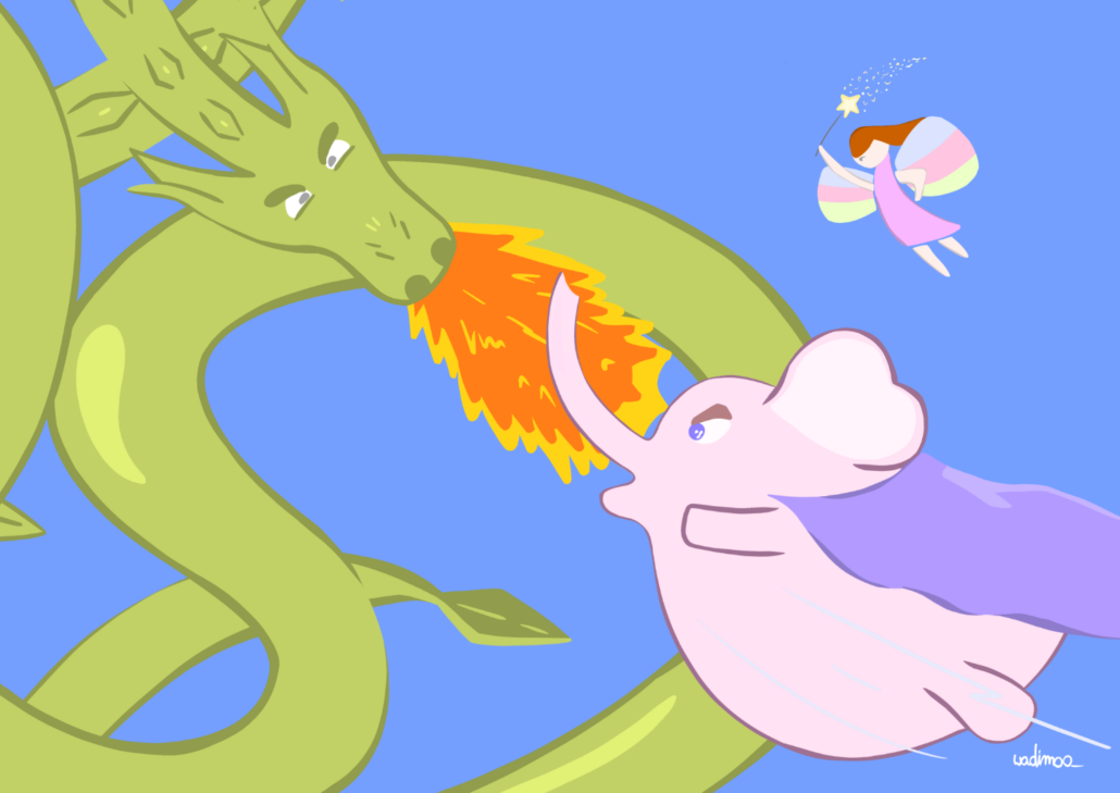 To do this, the elephant used his superhero cape and his powers—wind, fire, water, and lasers. But when Branquinho was spreading love all over the world, a flying dragon appeared and breathed fire. Branquinho used the power of water, but he couldn’t control the dragon’s fire, so he decided to ask for help from a fairy named Clou.