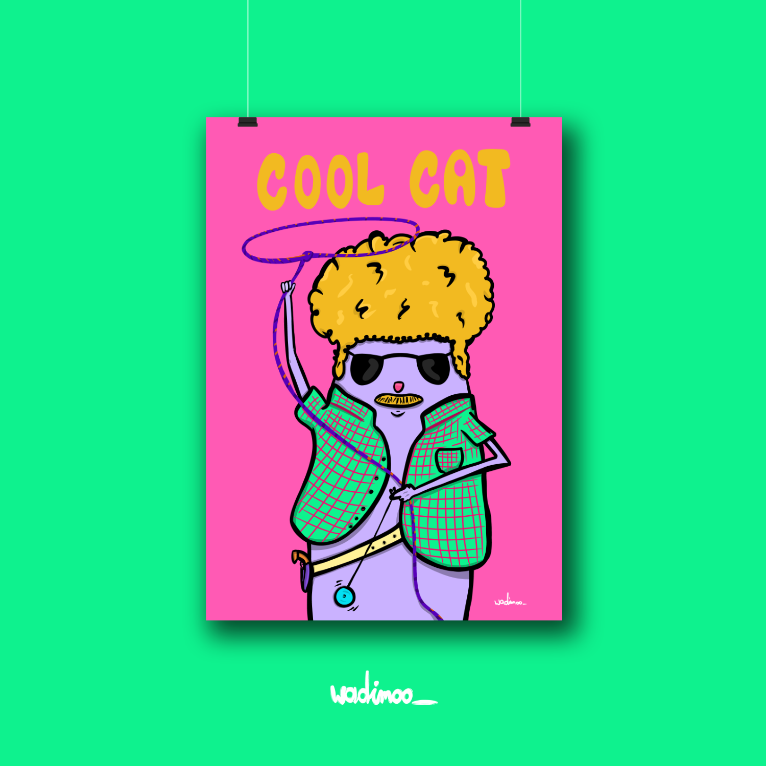 Plakat „Cool Cat” to kolorowa, humorystyczna ilustracja badassowego kota w retro wydaniu, który z pełnym luzem kręci lasso i ewidentnie wie, że jest cool. Intensywne kolory, charakterystyczna kreska i lekko absurdalny motyw sprawiają, że plakat od razu przyciąga wzrok i dodaje wnętrzu energii oraz dystansu do rzeczywistości. Idealnie sprawdzi się jako dekoracja do mieszkania, biura lub pracowni kreatywnej, szczególnie dla miłośników kotów, ilustracji z charakterem i nieszablonowego humoru.