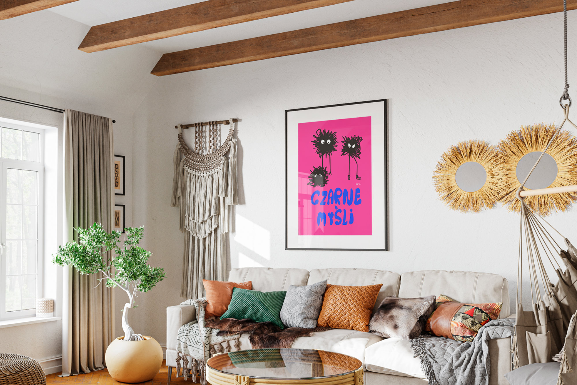 The poster “Czarne Myśli / Dark Thoughts” is an illustration that tells a simple yet playful story about a state familiar to everyone — a flood of thoughts, inner chaos, and those little dark clouds in your head.