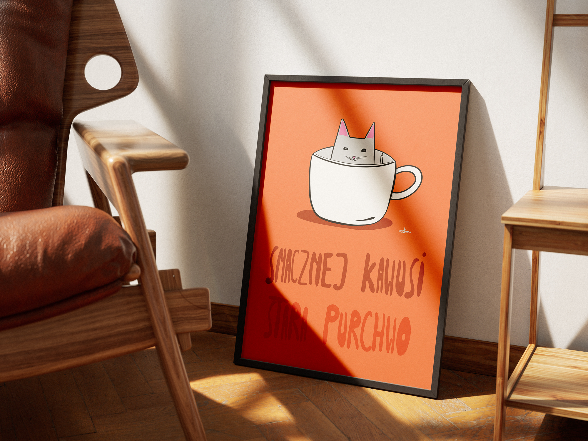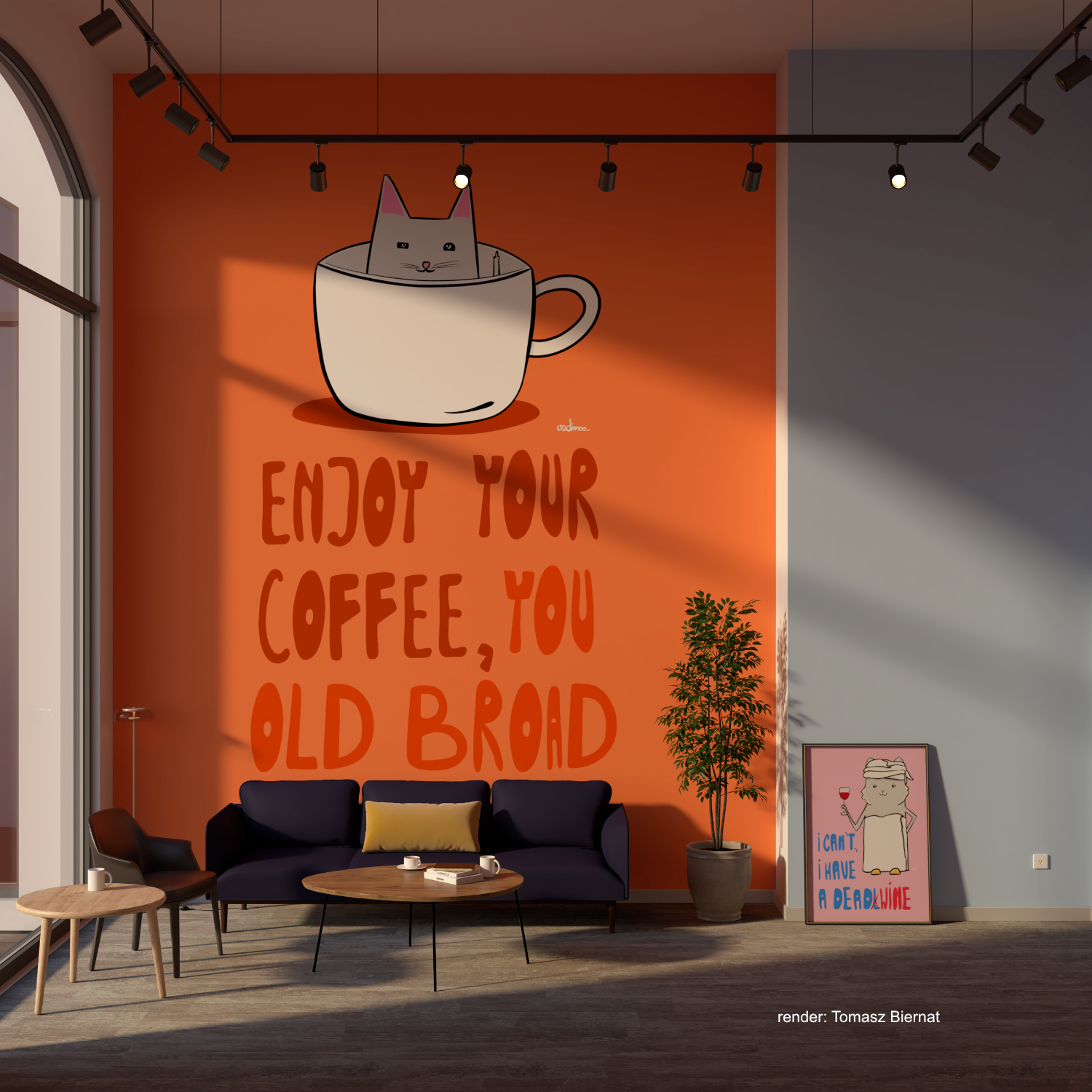 The humorous poster “Enjoy Your Coffee, You Old Broad” is the perfect addition to your interior! This playful illustration, featuring a cute cat in a coffee cup, will bring a smile to the face of any coffee and animal lover.