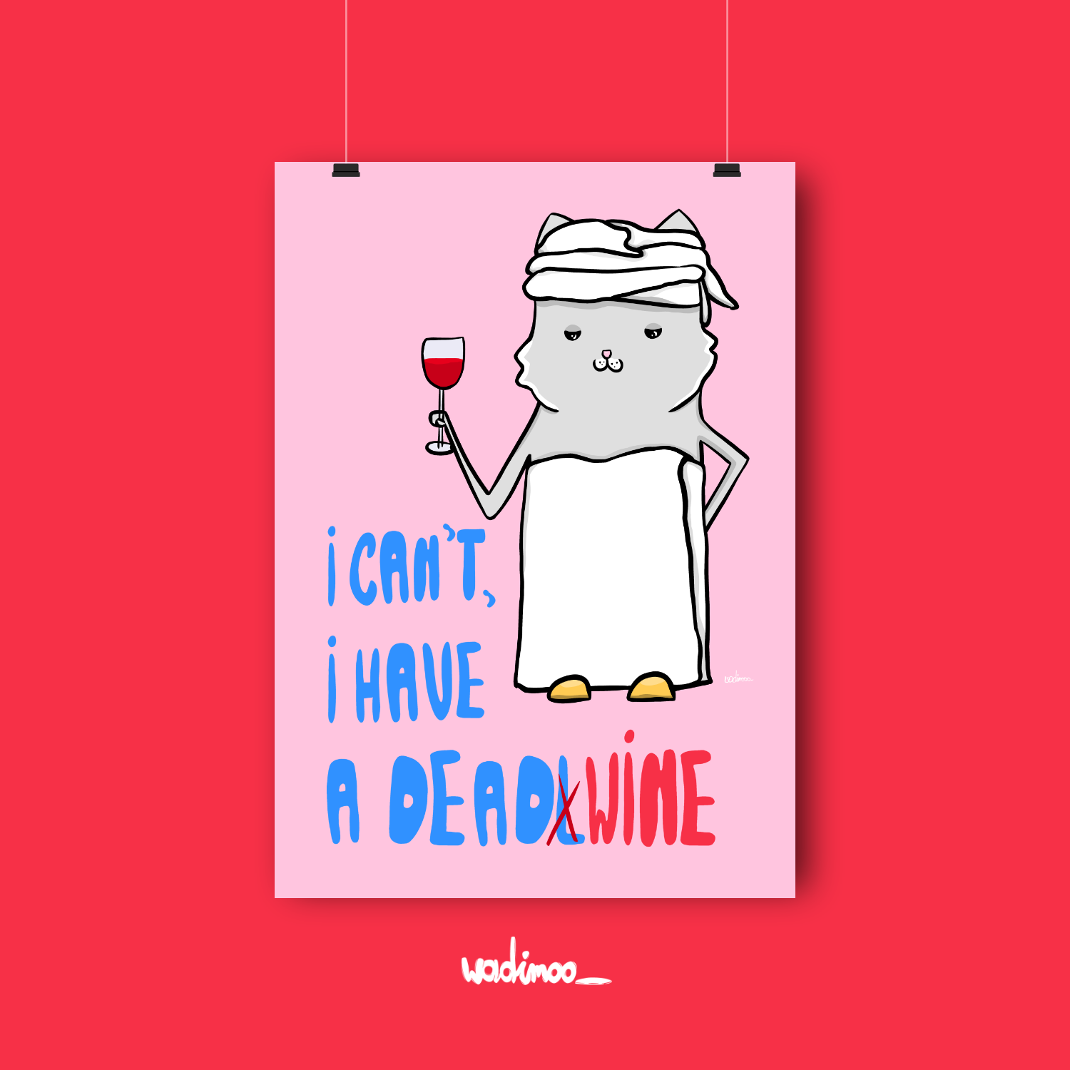 The poster “Can’t, I Have Deadwine” is a humorous illustration featuring a cat who knows how to really deal with stress. A cozy towel, a glass of wine, and total chillout — that’s the recipe for a perfect evening.
